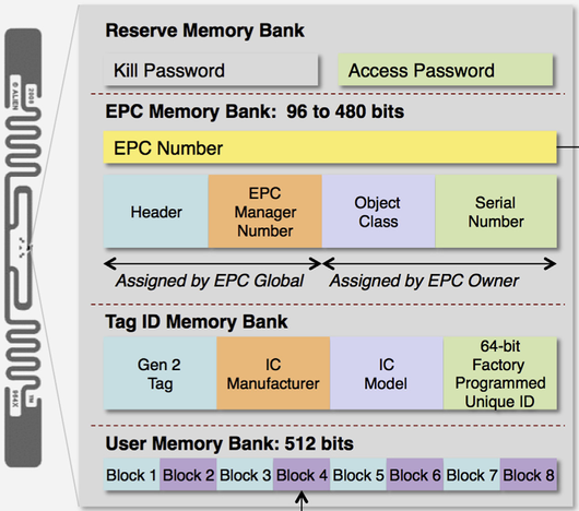 EPC là một chuỗi số và chữ cái, bao gồm: trường đầu tiên xác định nhà sản xuất. Trường thứ hai xác định loại sản phẩm và trường thứ ba là ID duy nhất của mặt hàng. Người đọc có thể tìm kiếm các mặt hàng có mã của nhà sản xuất hoặc mã sản phẩm cụ thể. Người đọc cũng có thể được lập trình để tìm kiếm các EPC có cùng nhà sản xuất và mã sản phẩm, điều này giúp bạn có thể nhanh chóng tìm thấy các sản phẩm có thể sắp hết hạn hoặc cần thu hồi.