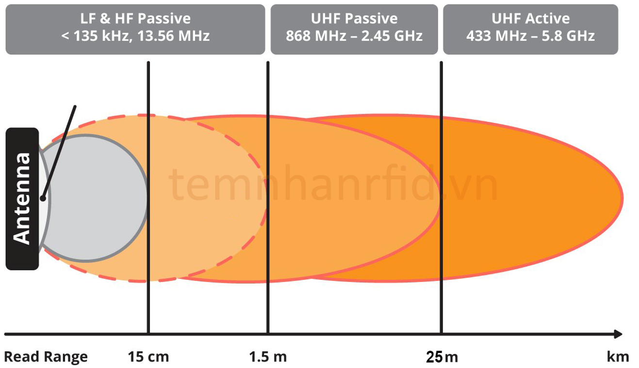 Phạm vi đọc phụ thuộc vào một số yếu tố, như tần số sóng vô tuyến được sử dụng, kích thước ăng-ten của thẻ, công suất đầu ra của đầu đọc và thẻ chủ động hay thẻ bị động. Các thẻ chủ động chạy bằng pin thường có phạm vi đọc là khoảng 100 mét, còn thẻ thụ động là khoảng dưới 25m. Thẻ UHF có phạm vi đọc tối đa 20m đến 25m, Thẻ NFC có tầm đọc khoảng 10cm. Nếu các thẻ được gắn vào các sản phẩm bằng nước hoặc kim loại, phạm vi đọc sẽ giảm. Nếu kích thước của ăng-ten UHF giảm cũng làm giảm đáng kể phạm vi đọc. Tăng công suất đầu ra có thể tăng phạm vi, nhưng hầu hết các chính phủ hạn chế đầu ra của đầu đọc theo tiêu chuẩn từng nước để chúng không gây nhiễu các thiết bị RF khác, chẳng hạn như điện thoại không dây.